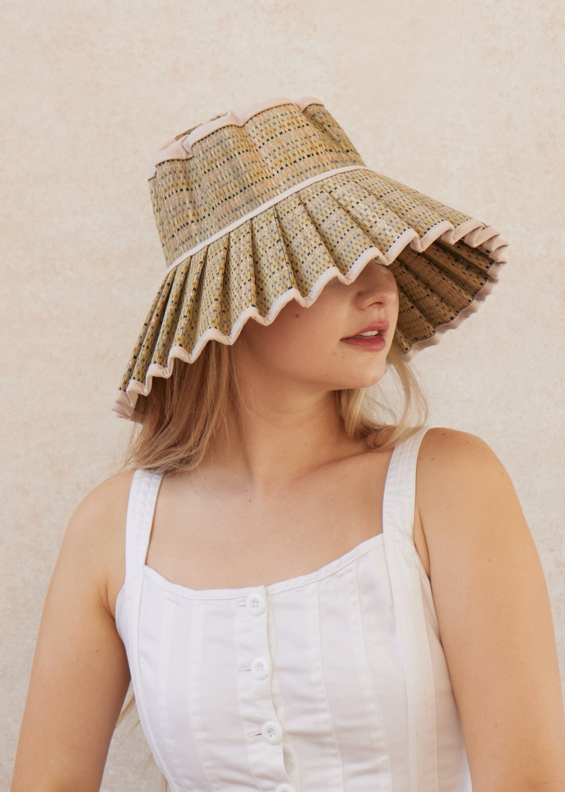 Saint Barthes features pink, lilac, navy, aubergine and caramel thread colours woven horizontally in stripes, through its natural grass fibre base, with pale-pink-coloured fabric trimming. The Capri Hat combines style and sun-safety with UPF 50+ certified protection. Maxi brim length for maximum coverage.