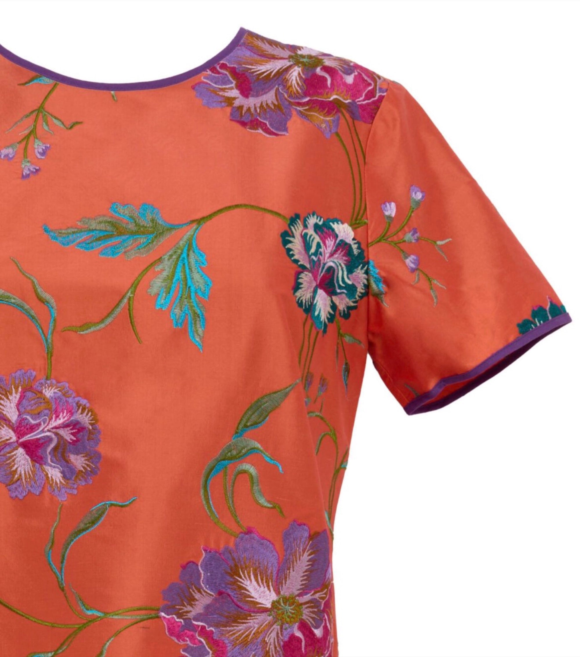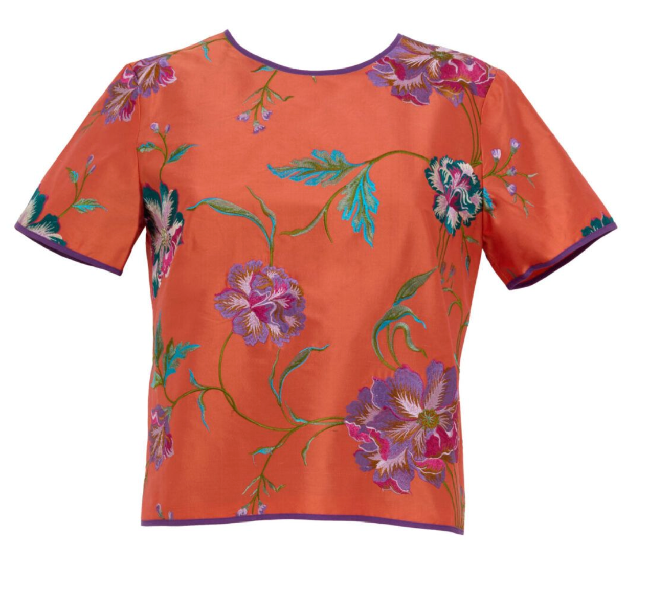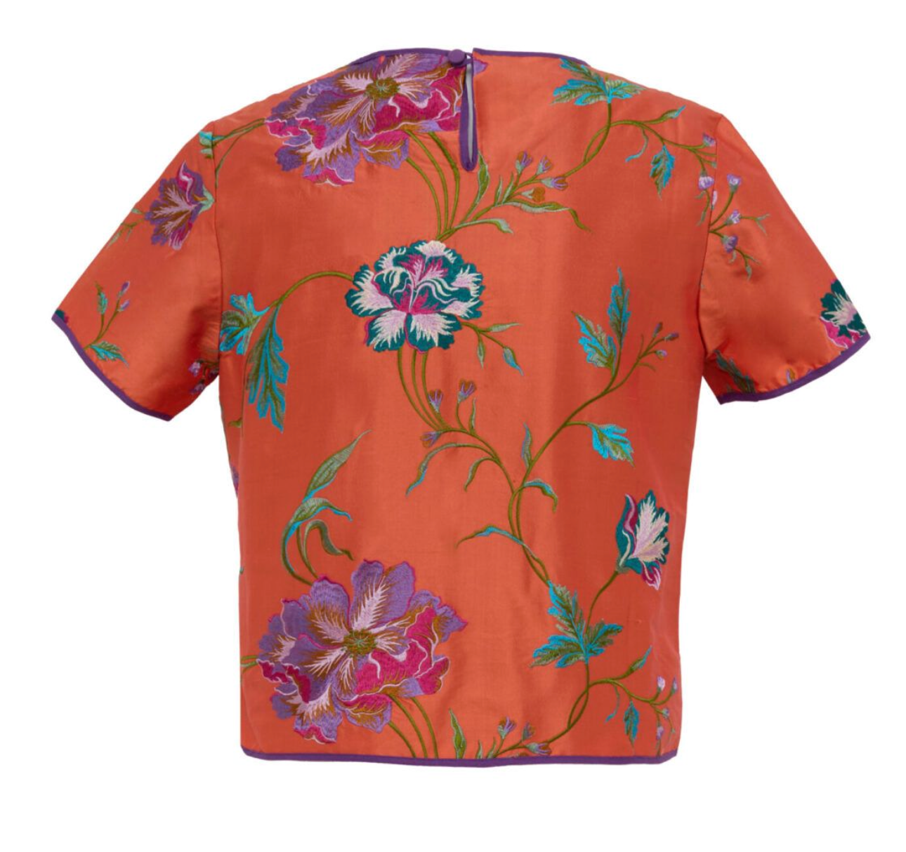 Round collar fully embroidered top in taffeta. The print comes from our archive and the fabric is made in Italy. Each piece is hand crafted by master artisans.