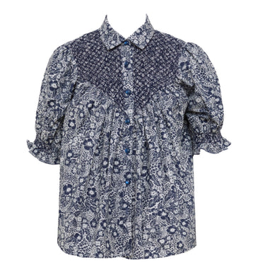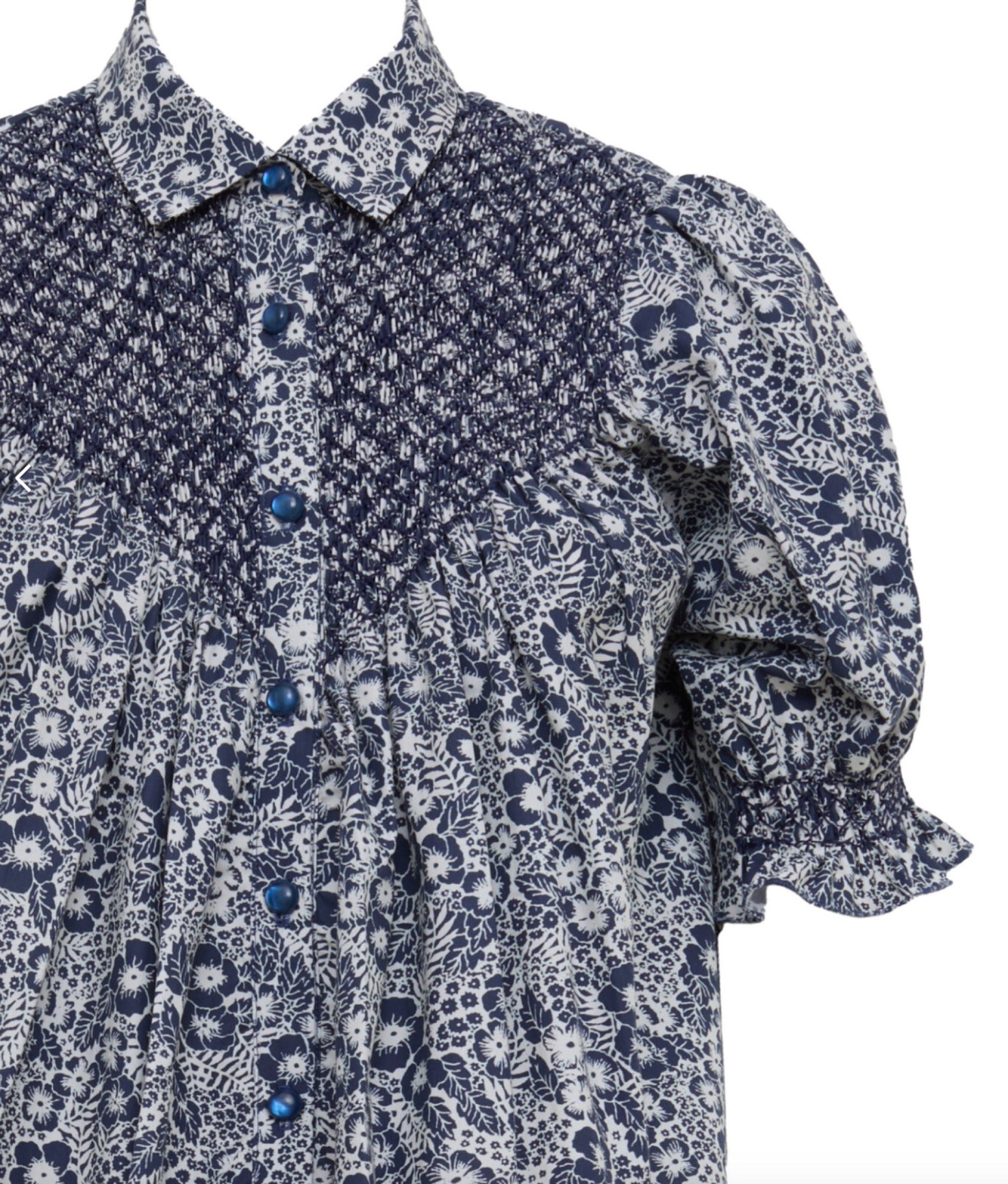 Front buttoned short sleeves shirt with contrast hand embroidered smocking details. The print comes from our archive and the fabric is made in Italy. All embroideries are made in Tuscany. Each piece is hand crafted by master artisans.