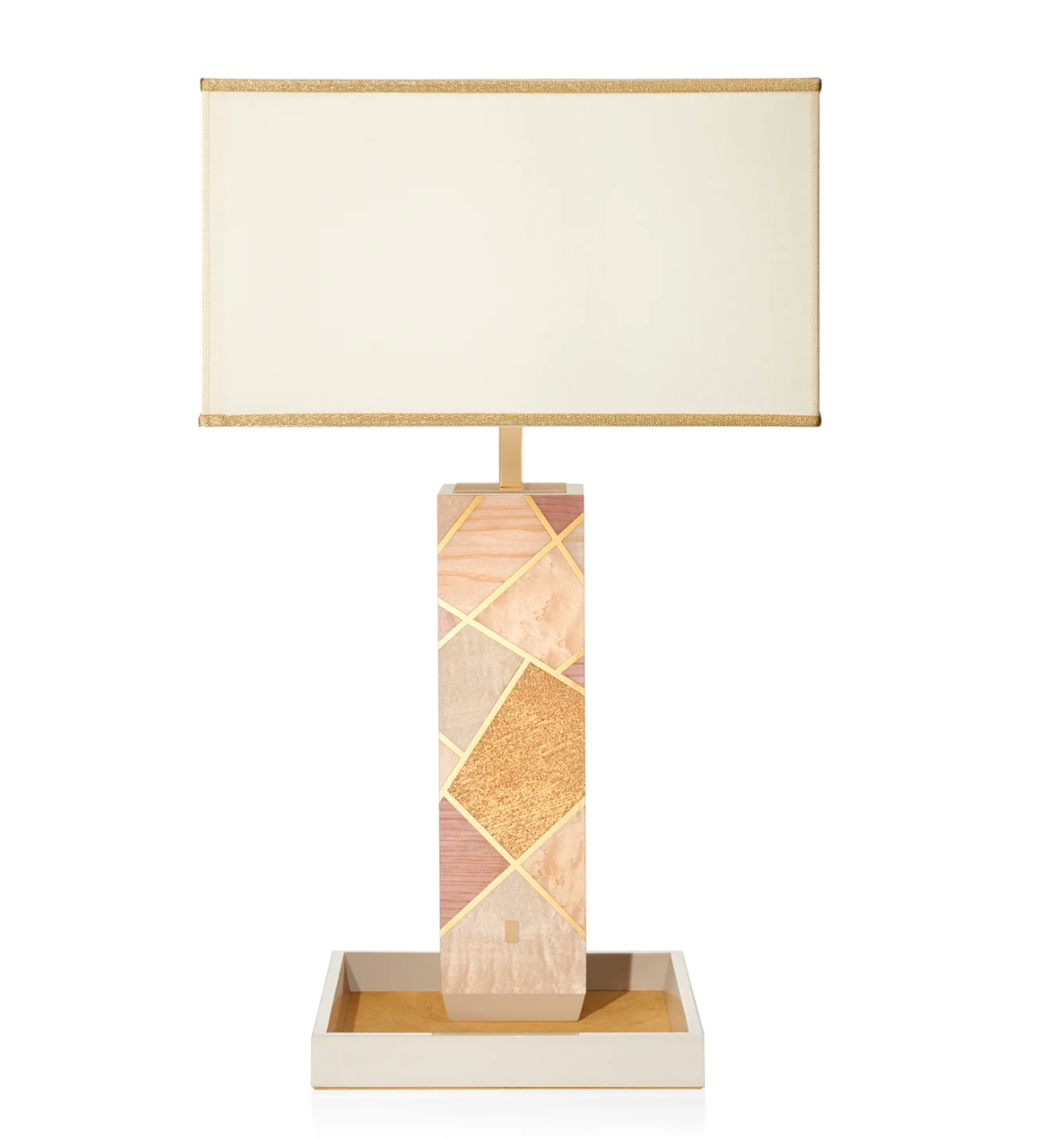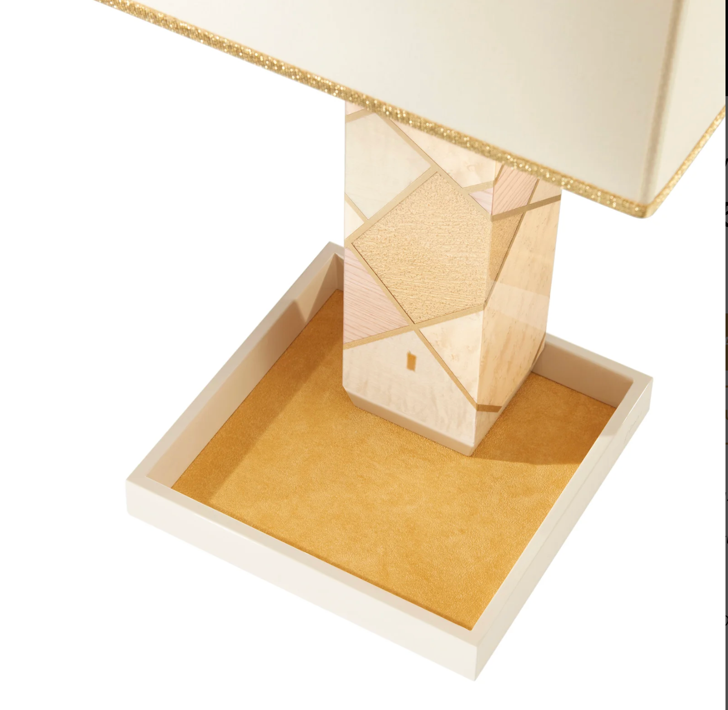 - Material: Wood (Legno), Fabric shade with golden trim